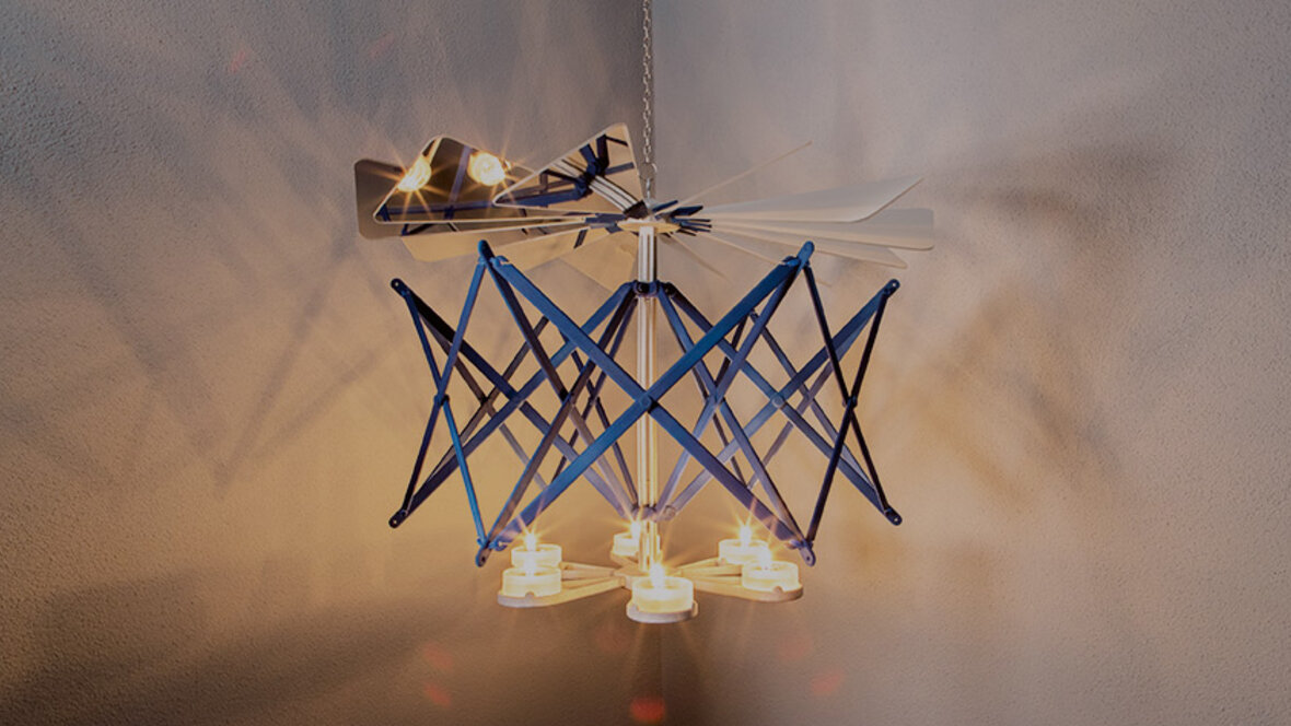 Gläserne Teelichttüllen bringen das natürliche Flammenspiel zur Geltung und schaffen eine warme, stimmungsvolle Atmosphäre. Das Flügelrad nutzt den Wärmefluss der Teelichte für eine sanfte Drehbewegung, während die verspiegelten Flächen faszinierende Licht- und Schatteneffekte in alle Raumrichtungen projizieren.